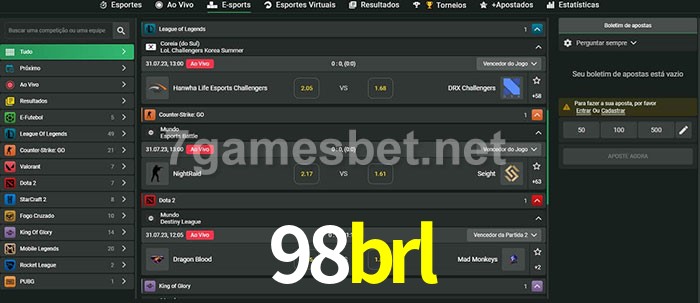 O 98brl oferece uma grande seleção de opções de apostas em e-sports com probabilidades competitivas